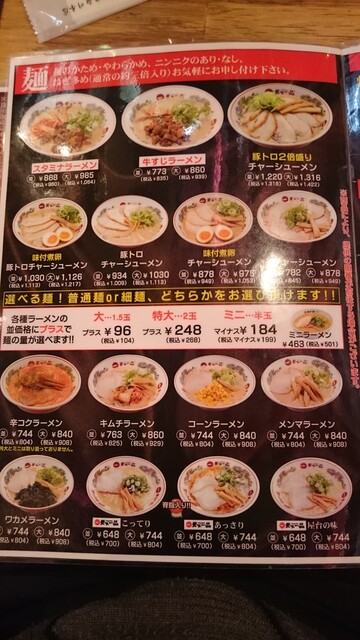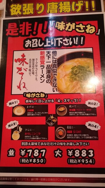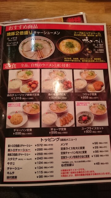 メニューは、「こってり」「あっさり」「屋台の味」の3種類ある中華そばが並700円・大804円、「チャーシューメン」並845円・大949円といった単品類に加え、「チャーハン定食」「ギョーザ定食」各968円、「鶏の唐揚げ定食」998円などの定食類も充実。以前よりもかなりメニューが増え、さらにメニュー構成が変わった印象。当時は並と言えば何も言わずにこってりだったし、唐揚は骨ありがデフォルトだった。学割はまだあるのかなあ。そのような中、ねぎ多めが無料で注文できるのは嬉しい。