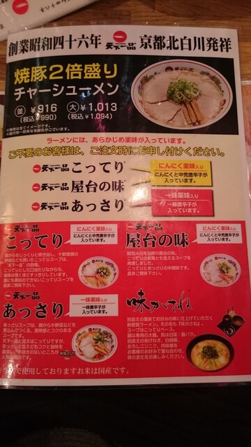 京都駅からバスで40分、四条河原町からバスで25分、白川通りを北進し北大路通りの少し手前の建物1階にある、昭和四十六年創業中華そば専門店天下一品。