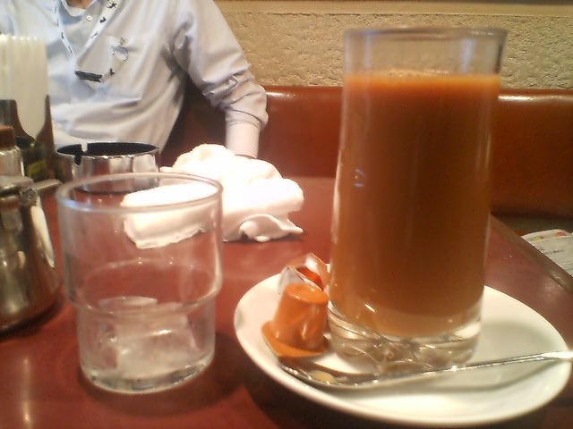 このコーヒー、他の客はコーヒーカップに入った普通のサイズだったが、目の前に持ってきてもらったコーヒーは、どどんとビッグサイズ。コーヒーも普通の3倍の量だ!コーヒーカップではなく、厚手のガラス容器になってしまっているのが笑える。