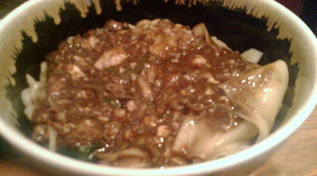まずは、つけ汁を使わずに麺と肉味噌のみで食してみる。この肉味噌は花椒がかなり効いたもので、口に入れるとすぐに舌の痺れを感じる。それでいて、徐々に麺の持つ甘みとうまく調和していくのが分かる。つけ汁をつけなくてもこれだけで十分食べられると思える完成度。「一反も麺」のピロピロした形状が口の中で独特な動きをする。