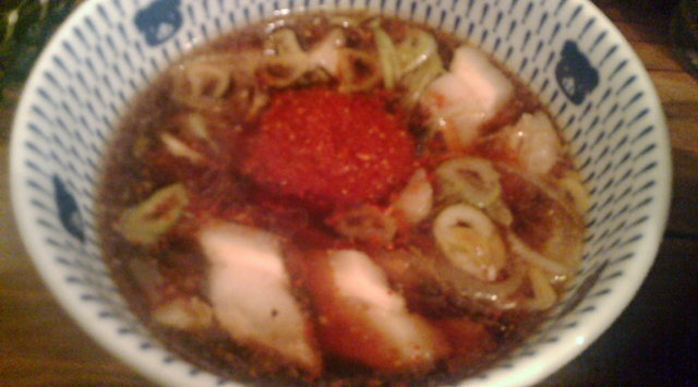 つけ汁の中には、チャーシュー、メンマ、輪切りのネギ、海苔が入っている。