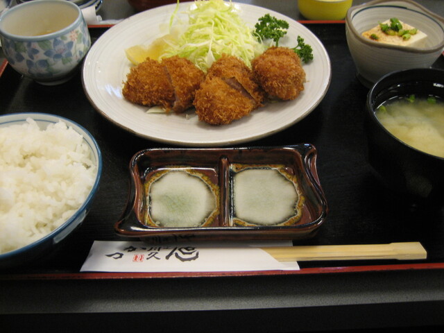 メニューは、「ロースかつ」980円、「ヒレかつ」1,150円、「エビフライ」1,050円、「ミックスフライ」1,050円、「チキンかつ」850円、「みそかつ丼」950円など。「とんかつ」を看板に掲げているものの、とんかつ以外のメニューも結構ある。ロースかつやヒレかつには「上」もある。