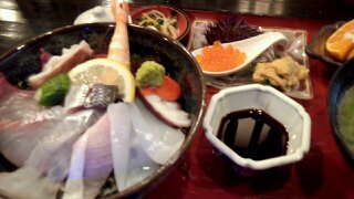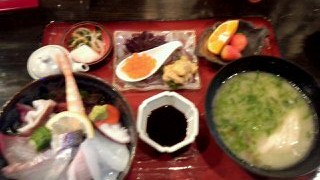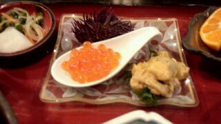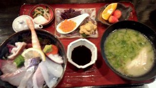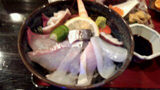 メニューは魚介類を中心とした一品料理が各種あるが、昼夜とも食べられる定食系メニューは、「有明御膳」3,000円、「黒潮御膳」「うに丼」各2,000円、「刺身定食」1,800円、「ぜいたく丼」1,500円、「マグロ丼」「海鮮丼」各1,000円など。