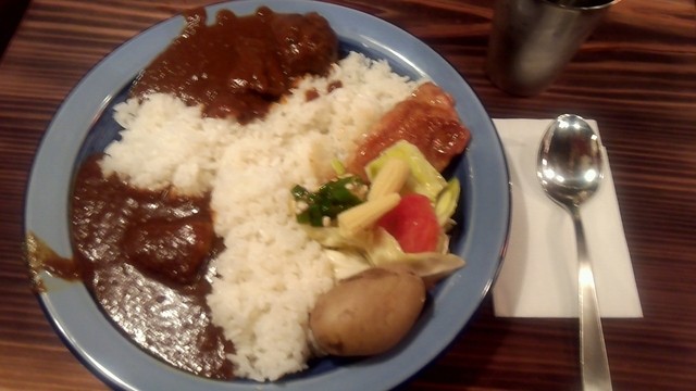 このカレー、ビーフ、ポークとも味付けは一緒。ドロドロ濃厚なカレールーは口に入れるとリンゴから醸し出されたようなフルーティーな香りが感じられる。それとともに、タマネギの風味もじんわりと感じられる。野菜や果物を形がなくなるまで煮込んで作ったカレーという触れ込みはだてじゃない。ちょっと独特な味わいで好みが分かれるかもしれないが、個人的には気に入った。