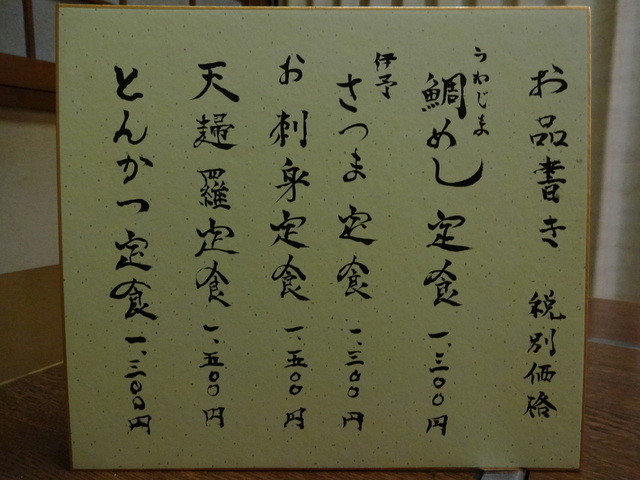 メニューは、「鯛めし定食」「さつま定食」各1,300円、「お刺身定食」「天婦羅定食」各1,500円といった海の幸を活かした定食に加え、「カレーライス」「親子丼」「肉うどん」各600円など大衆食堂的メニューも豊富。「宇和島じゃこ天」500円や「鹿刺身」850円といった一品料理も多数あった。価格は税別。