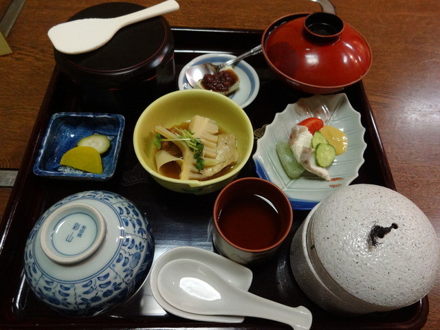 煮魚は鯛の煮付けだろうか。甘辛の味付けはやや濃いめで、一緒に添えられた豆腐にも味が染み込んでいる。一緒に煮込まれたタケノコの味わいもいいい。