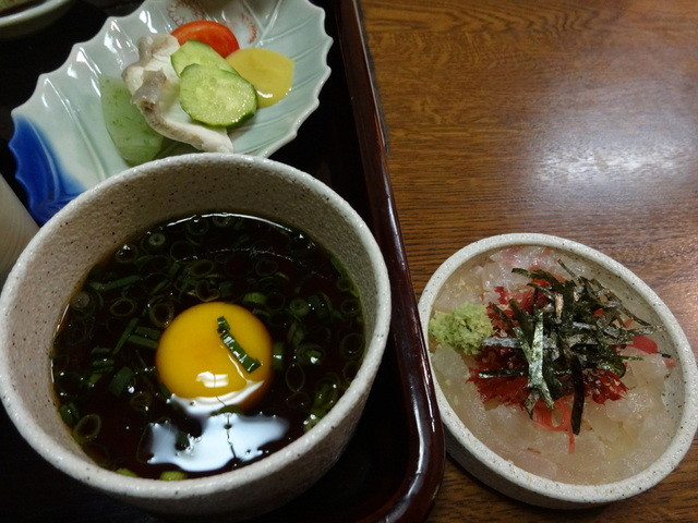 鯛の切り身、生卵入りダシ、ご飯、味噌汁、小鉢、煮魚、漬物、デザートという構成。鯛の切り身とダシは二段の器に入っている。
