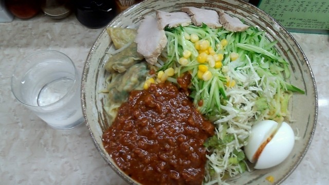 のっている具は、キュウリ千切り、モヤシ、コーン、チャーシュー4枚、ワンタン3個、ゆで卵。