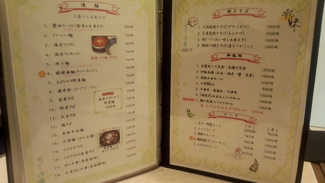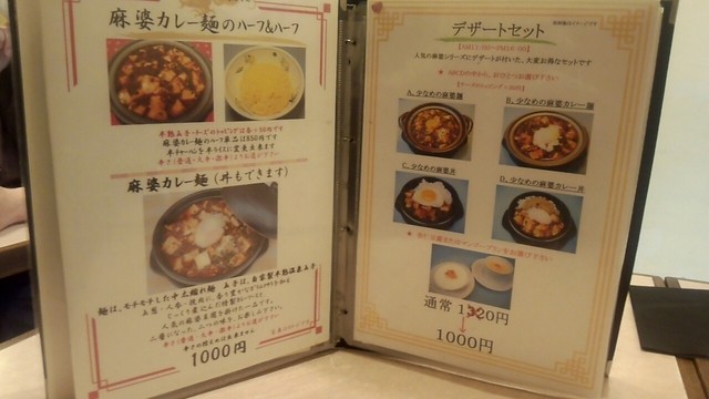 ランチメニューは、「麻婆麺」「麻婆丼」「ハーフ&ハーフ」「麻婆春雨定食」各1,000円、「豆腐と肉とニラ炒め定食」「野菜麺」各950円など。ランチメニュー以外にも各種麺類・焼きそば・御飯物等があり、単品価格は900円~1,000円がボリュームゾーン。
