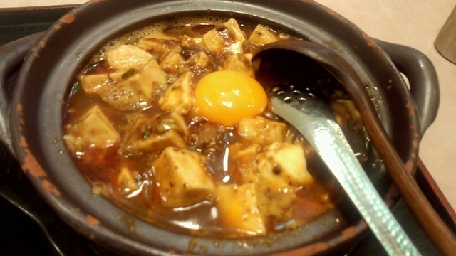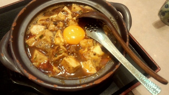 麻婆麺は土鍋に入れられた状態で提供され、ぐつぐつと煮え立っている。レンゲは穴なしと穴開きの2種類用意される。有料オプションの生卵は中央にのせられている。