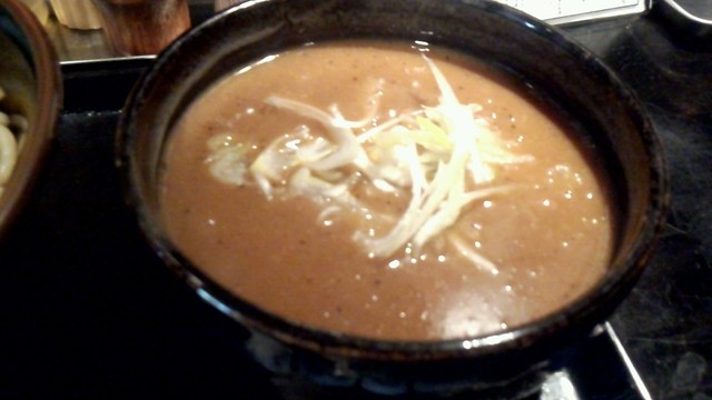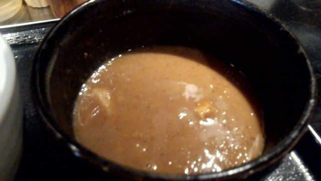 つけ汁はかなりポタポタした、濃厚でクリーミーなもの。豚骨のパンチのある風味を最初に感じるが、徐々に鶏のまろやかな味わい、野菜や果物からきているであろう甘み、魚貝の風味、コショウのピリッとした口当たりなどが複雑に混じり合う。主張の強い素材がいくつも組み合わさっているのに、どれかに偏った味になっておらずバランス良くミックスされていて、素直に美味しく感じられる。