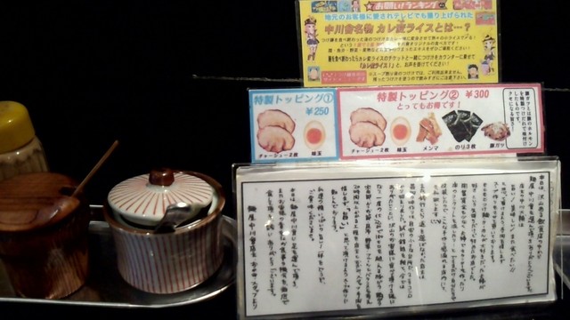 麺の量が多いだけに、さすがに終盤味が単調になるが、卓上の柚子パウダーを使い、口の中がさっぱりする。
