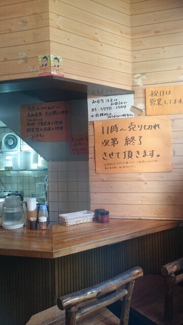 店内は少々狭いものの、外観同様ログハウスっぽい雰囲気。店内は広くなく、やや窮屈な印象。店内ではニッポン放送が流れている。席は入って左手に4人用テーブル2卓、右手に厨房に面したカウンター5席。卓上に灰皿は置かれておらず、福神漬けやチリパウダーがスプーンや水入りポットとともに置かれていた。