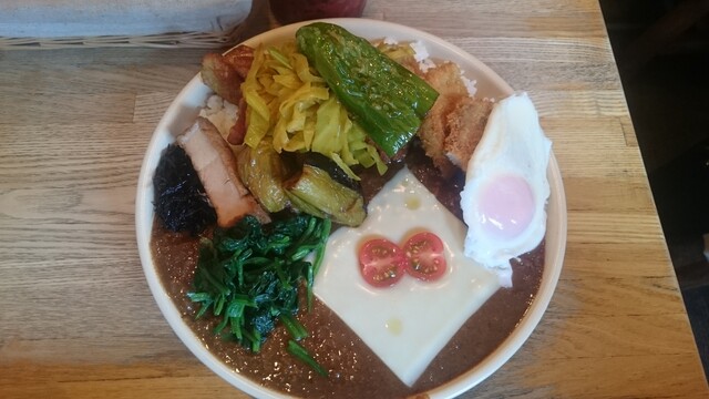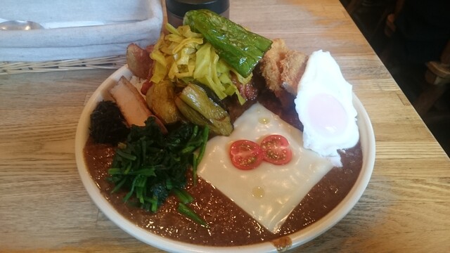 のっている具は、唐揚、ロースかつ、ナス、ピーマン、スライスチーズ、ミニトマト、ほうれん草、目玉焼き、厚揚げ、茹でキャベツ、ひじき。中にはカレーの具としては普段お目にかからないようなものまで混じっているが、これら大量の具が崩れないよう絶妙なバランスで盛りつけられており、彩りもうまく計算されている。