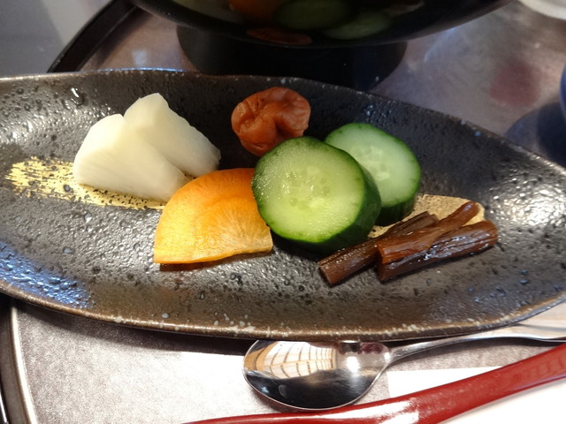 漬物はキュウリ、大根、ニンジン、きゃらぶき、梅干と5種類ものっており嬉しいだけでなく、親子丼の味のアクセントにもご飯のおともにもなってくれる。