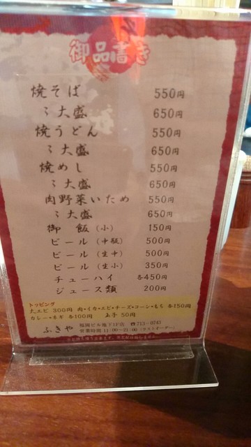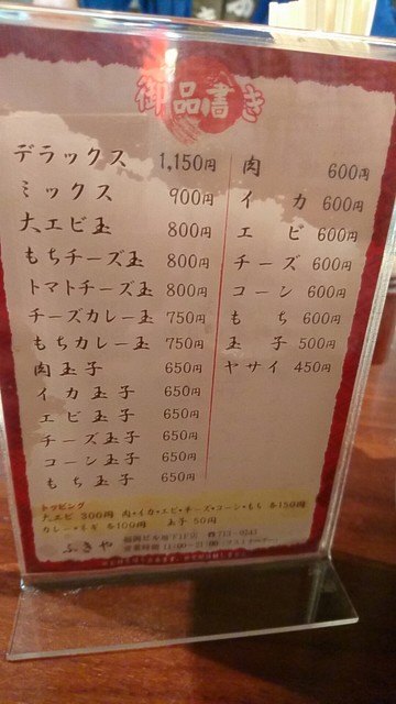 メニューは、「野菜焼」450円、「玉子焼」500円、「肉焼」「イカ焼」「チーズ焼」各600円、「肉玉」「イカ玉」各650円、「ミックス」900円など。「焼そば」「焼めし」各550円などお好み焼き以外のメニューもある。