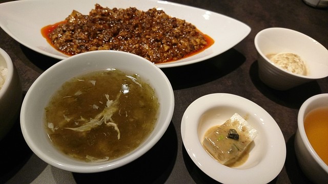 スープはとろみがあり、ほのかにショウガの風味が感じられる。具は生海苔が細かいながらも入っている。前菜はピータン豆腐とのことだったが、ピータンはほんの僅か。上にはゴマダレがかけられている。