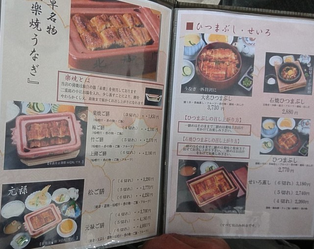 楽焼うなぎがメインとなり、うなぎ3切れの「楽焼ご膳」1,850円・4切れの「梅ご膳」2,160円・5切れの「竹ご膳」2,670円・6切れの「上蒲ご膳」3,180円があり、さらに蓋物付きの「松ご膳」や天ぷら付きの「元禄ご膳」もある。「鰻丼」2,160円や「ひつまぶし」2,770円などの他のうなぎ料理、鰻会席各種、さらには「天ぷらご膳」「刺身ご膳」各1,840円などのうなぎ以外のメニューもある。