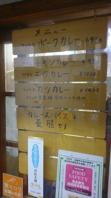 メニューは、「リッチなチキンカレー」「リッチなポークカレー」各950円、「リッチなエッグカレー」1,000円、「リッチなカツカレー」1,450円。ドリンク類が数種類ある。メニュー表に大盛りの記載はなかったが、レディースサイズとして小盛りが各100円引きで設定されている。