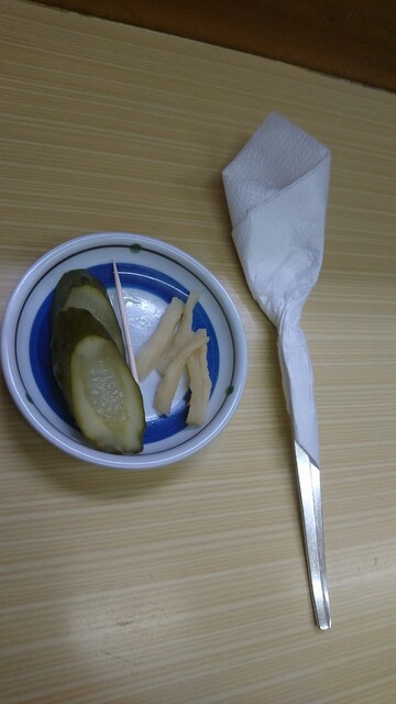 漬物はキュウリとダイコンで、かなりの浸かり具合で塩分強めなので懐かしさを覚える味である一方、最初口にした時はカレーのお供としては主張が強すぎるように思えた。先の提供ということもあり爪楊枝を添えて供されるのが心憎い。