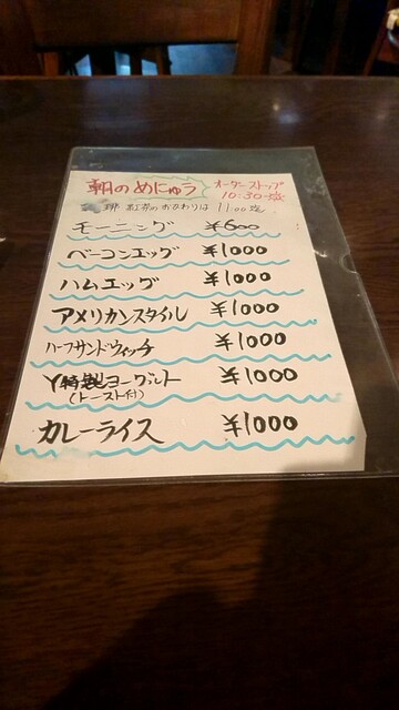 食事メニューは「Y定食」「カレーライス定食」各1,000円や「しょうが焼定食」「ハンバーグ定食」各1,200円などがあるが、“朝のめにゅう”は、「もーにんぐ」600円、「ベーコンエッグ」「ハムエッグ」「ハーフサンドウィッチ」各1,000円などが並ぶ。勿論、喫茶店だけに喫茶メニューも揃う。