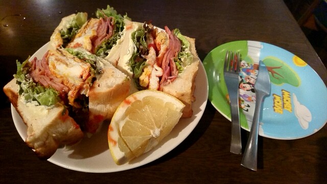 サイズが大きい、具だくさんで持ちにくく持ち上げると具がこぼれそうになる、ケチャップやマヨネーズが垂れそうになると、口に運ぶにあたってはいくつもの難関がある。取り皿も用意されているが、結局手でサンドイッチを持ち上げて口まで運ぶことは断念し、フォークとナイフを使って分解しながら食べ進めることに。
