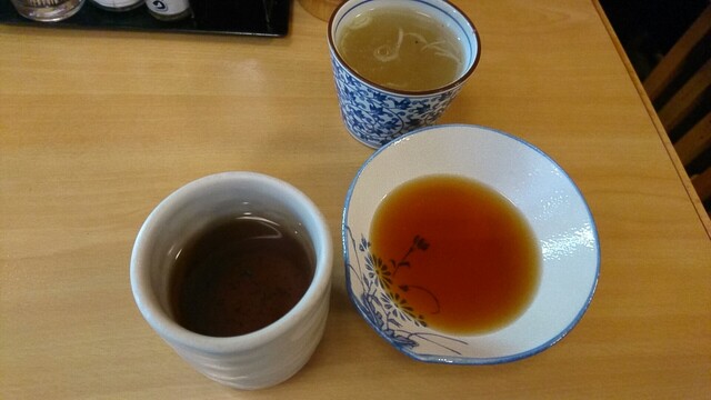 注文してからすぐに、温かいお茶、ポン酢、それに鶏スープが提供される。