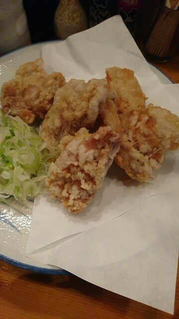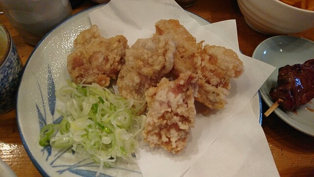からあげは5個入りで、そのうち2個は骨付き。脇に添えられているものは千切りキャベツかと思いきや刻みネギだった。このからあげ、表面が白っぽいのが特徴の一つで、竜田揚げみたいなビジュアル。