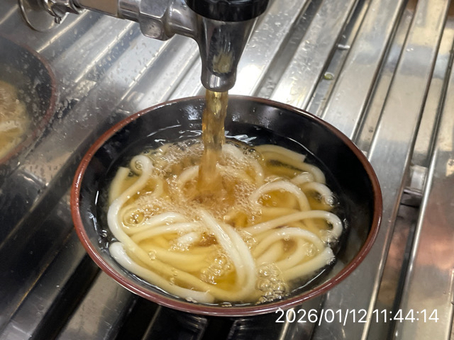 麺が茹でたら、通常麺がこれ以上進まないないように水で締めます。それを再度温めて、出汁で食べるのがかけうどんです。