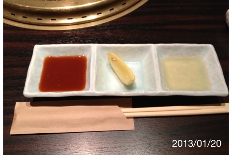 2013.1.20(日)17時 1名予約 塩ホルモン盛り合わせ715円は、ニンニク醤油をお願いして\(^o^)/