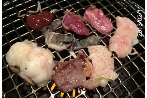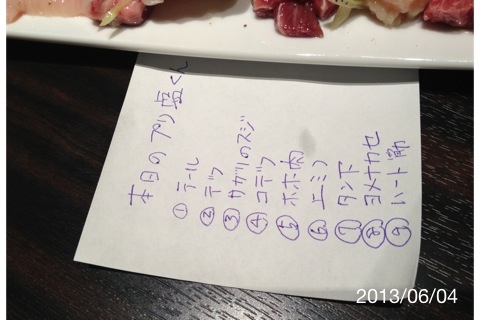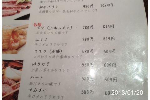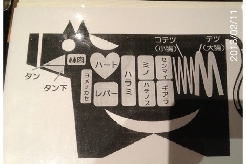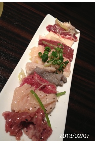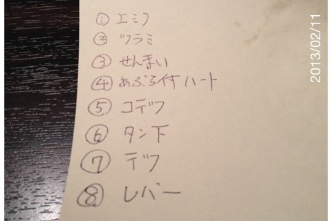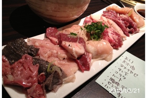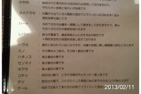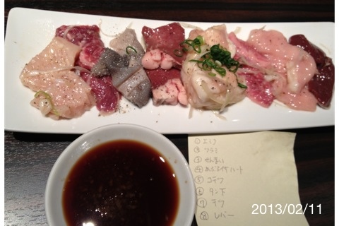 2013.2.21(木)17時半訪問 ホルモン盛り合わせの内訳 680円で9品(^。^)