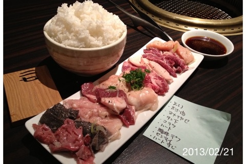2013.2.21(木)17時半訪問 ホルモン盛り合わせ三人前とご飯てんこ盛り2500円也*\(^o^)/*