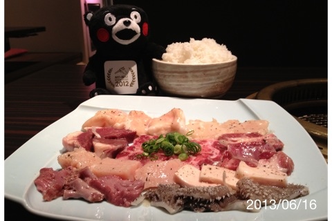 2013.6.16(日)17時 いつものホルモン盛合せ三人前とてんこ盛り白ご飯 ニンニク醤油で\(^o^)/
