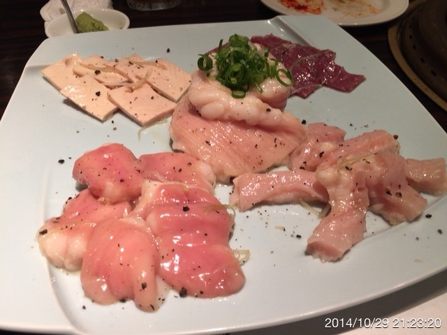 2014.10.9(木)17時半 塩ホルモン盛合せ三人前とてんこ盛りご飯をワサビ醤油でd(^_^o)