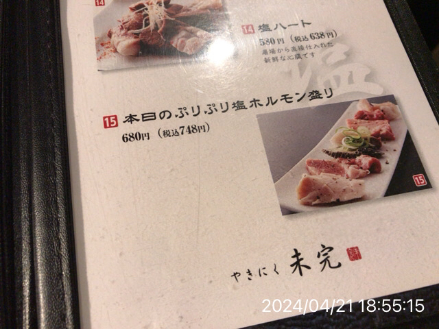 いつもの塩ホルモン盛合わせ858円×二人前、