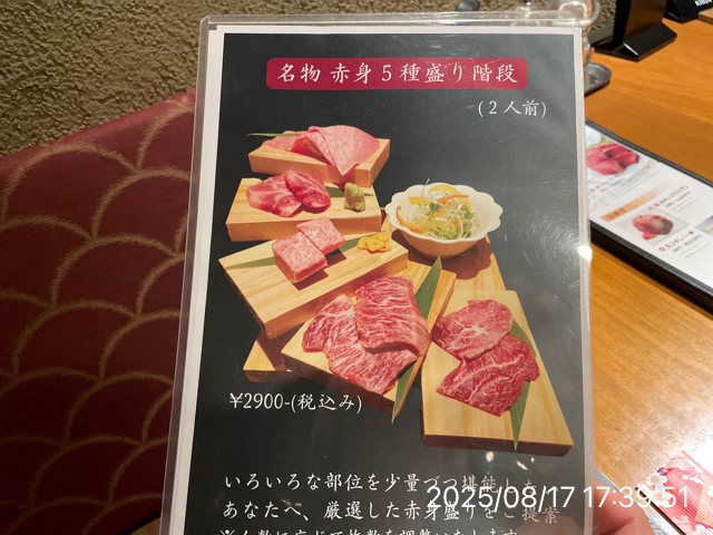 注文 いつものぷりぷり塩ホルモン盛合わせ2人前、てんこ盛り白飯、キムチ盛り合わせ、そして、初の赤身5種盛り階段頼んでみました。