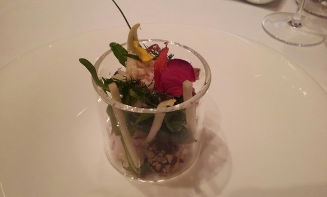 もう大分前になりますがレストランサンパウのランチにお友達と行って来ました‼コレド日本橋の別館みたいなところにあります。先ずは泡で乾杯しました小さなカップに入ってお花のようと思ったらカップは底がなくてさっと取るとサラダの花畑が広がりました素敵な演出メインは甘鯛デザートも美しく美味しいこのお店の本当の価値はもっと上のコ−スになるとは思いますが三ツ星レストランの味と風格は充分楽しめました!