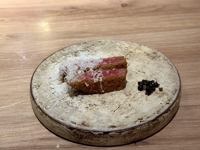 松坂牛で静岡のマスクメロンとマスカルポーネチーズを巻き、上に栗の蜂蜜がかかっています。