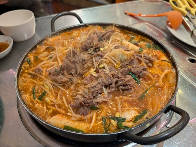 具材が豪華! 牛肉のしゃぶしゃぶ、ジューシーな豚のカルビ、シャキシャキの豆もやし、水餃子、トッポッキなどが一つの鍋で楽しめます。