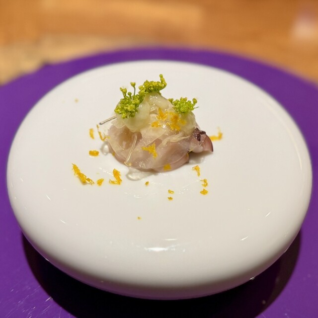 出汁のジュレが添え、奥にはマイクロリーフとワサビ