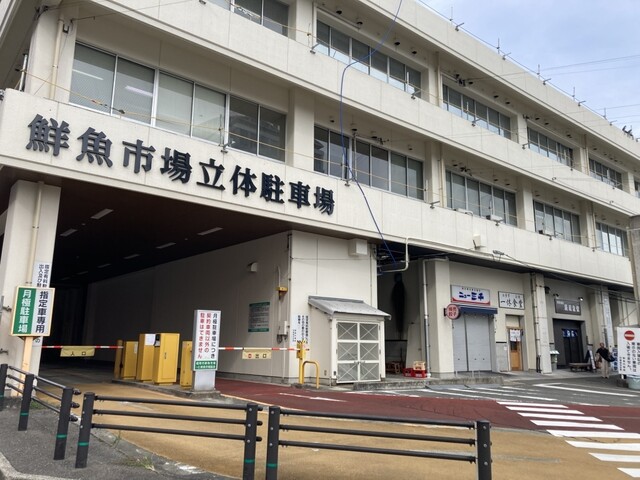 お店が入ったビルにある鮮魚市場立体駐車場には一般車は停められないので、隣の市場会館のコインパーキングに停めました。最初の30分は無料です。