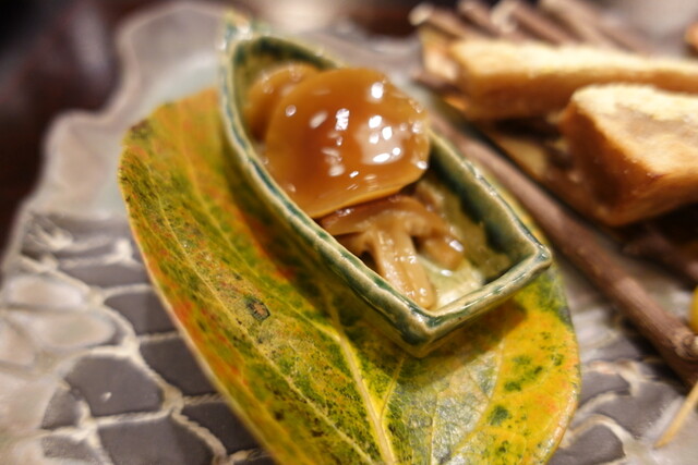 子持ち鮎の揚げ(飯ソースがけ)、紫しめじ、栗、ぶどう、そうめんかぼちゃなど