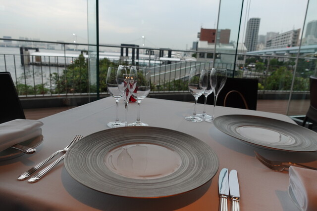 レインボーブリッジ、日の出桟橋に渡る電飾の橋がとてもきれいな場所ですが、店に入って着席すると、よくわかりました。この景色は、少し小高いところにあるこの店のなかから眺めるのが一番きれいです(食後、店の外からも眺めましたが、やはり、店の中からの方がよかったです)。