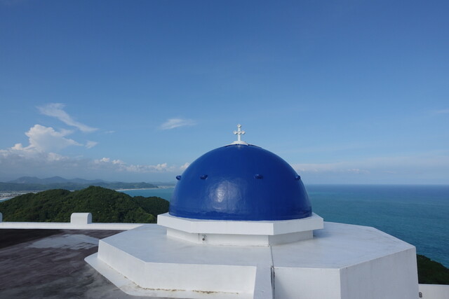 青い海を臨む「青」と「白」の建物。本物のサントリーニには行ったことがありませんが、十分、雰囲気があると思います。目の前にある海はエーゲ海ではなく、高知の海ですが、高知の海も青くてきれい。