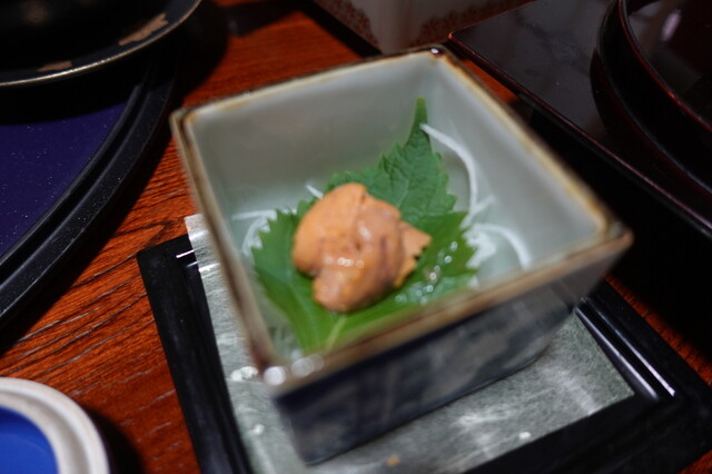 ④ 雲丹の茶碗蒸しも押しの一品。その他、タラバガニの内子、カスベの煮つけなどの珍味系は日本酒によく合う。ちなみに、日本酒は「北の勝」1種類。
