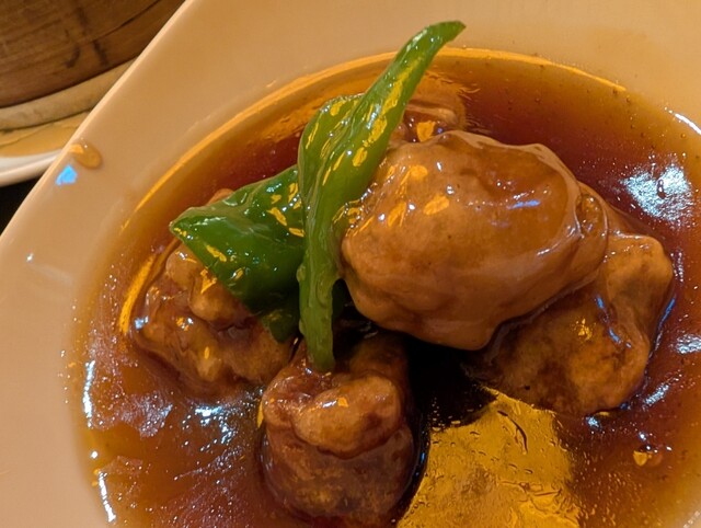 豚肉が素晴らしく薄皮でカラっと揚げられており、なかのお肉は柔らかく、黒酢餡との調和が素晴らしいのです。