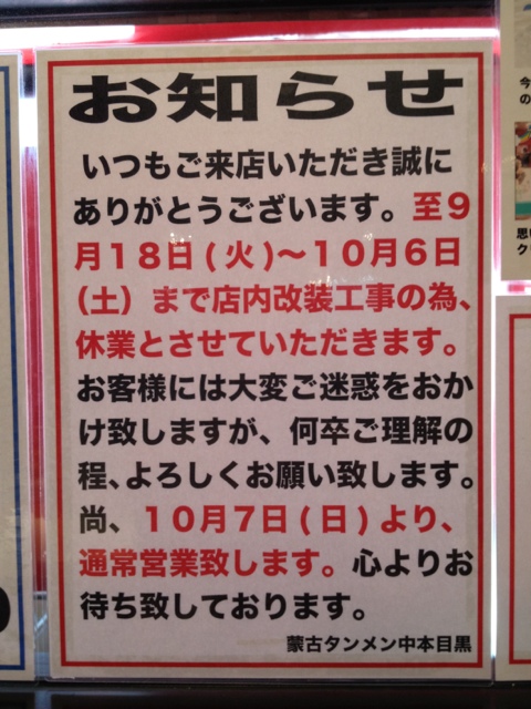 激辛好きにはたまらない!ラーメン辛さの中にも旨みが十分入ってる中本の蒙古タンメン。私は特に辛いの大大大好きなので、北極野菜・冷やし味噌やさいを更に辛さ5倍で食べたりしています。辛いのが苦手な人も塩タンメンなどがあります。にんにくが利いてて美味しいです。やっぱりお店の名の通り蒙古タンメンが一番人気で、中華そば風のまろやかなスープに辛い麻婆豆腐が乗ってて丁度良い辛さに仕上がったラーメンです。週末のランチや平日のディナーの時間になると必ず並ぶので要注意。ちょっと時間を外していくのベストです。9月18日(火)~ 10月6日(土)まで店内改装工事の為、休業するそうなのでご注意を。品川店も澁谷店もあるので、我慢できないかたはそちらも良かったですよ~。