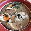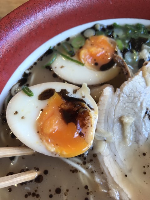 配膳されたラーメンは、茶濁のスープにチャーシュー、もやし、ネギ、メンマ、生姜、煮玉子。