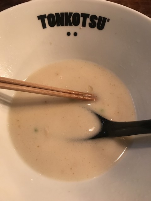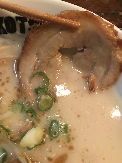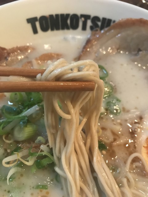 こちらも程なくして配膳。見た目はちゃんとしたトンコツラーメン。キクラゲがなく、メンマに変わってるぐらいで、チャーシュー、ねぎ、味玉、表面に香味油でしょうか。