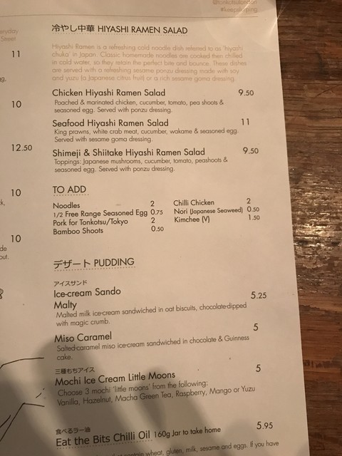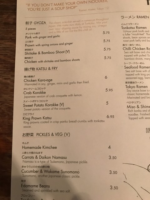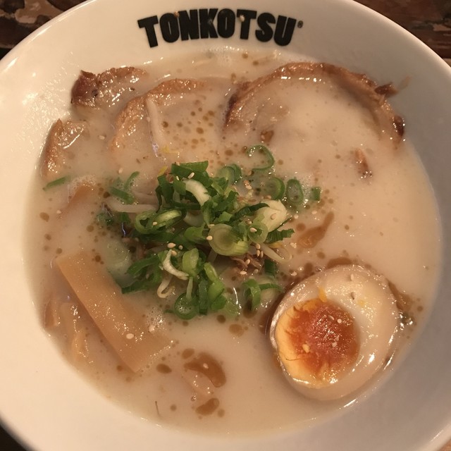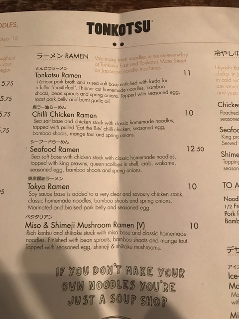 その名もTONKOTSUというラーメン店。 メニューはトンコツの他、鶏ラー油、シーフード、醤油、ベジタリアンなどありました。 その他にも餃子や唐揚げ、冷やし中華なんかもありました。